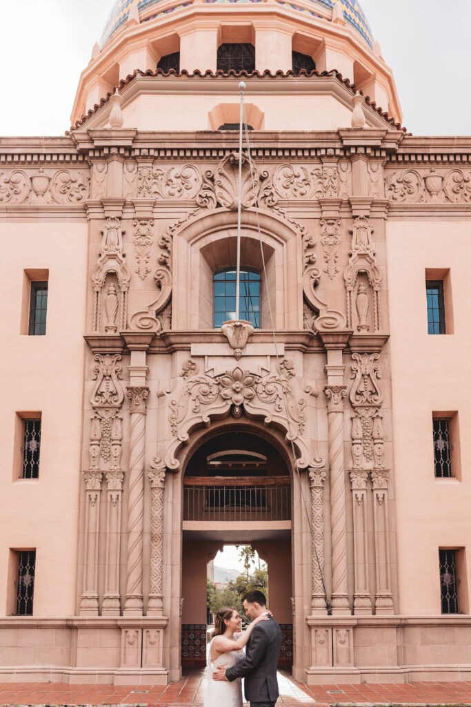 Bride and groom standing together on the courthouse stairs for a Tucson wedding photography session